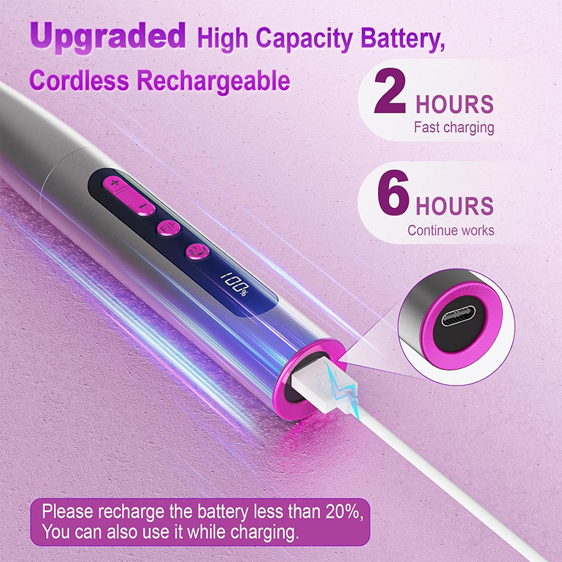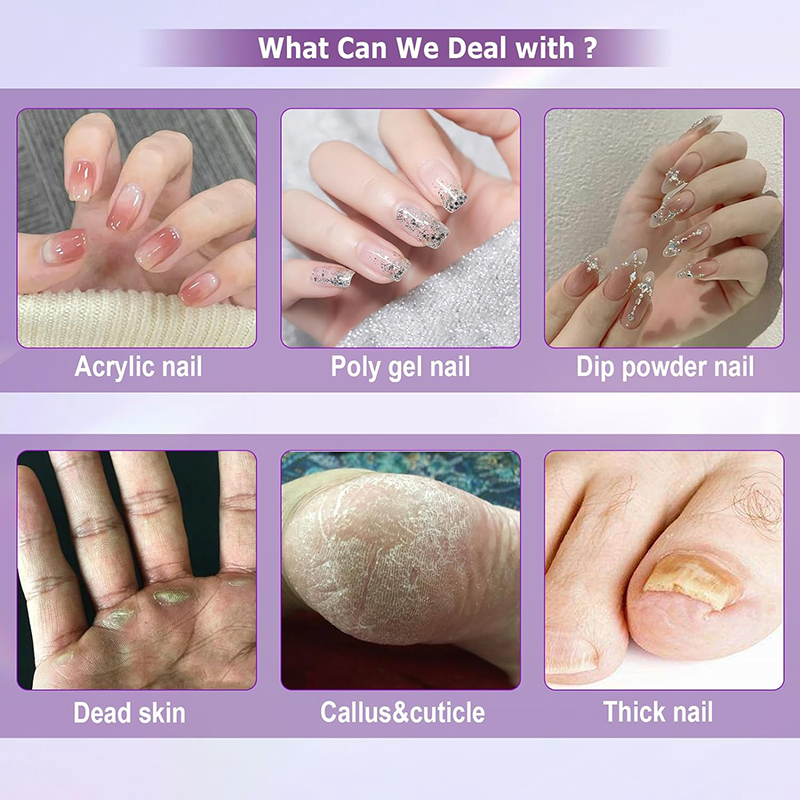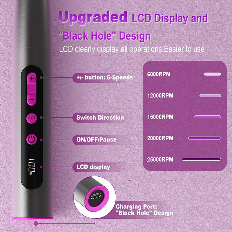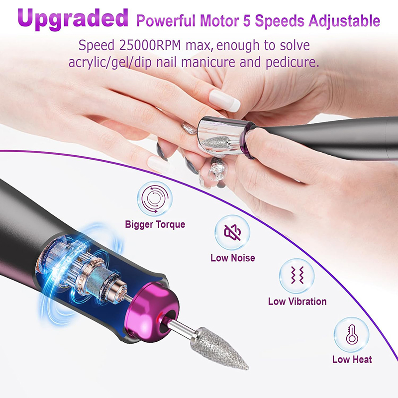elektriline naelatrell Täiustatud suure mahutavusega aku, 2 tundi Kiire laadimine ja 6 tundi Jätkake tööd. Elektriline küüneviil sobib teie USB-toiteadapteri, sülearvuti, mobiilitoitega jne. Kui akutrelli võimsus on alla 20%, saate seda kasutada ka laadimise ajal.