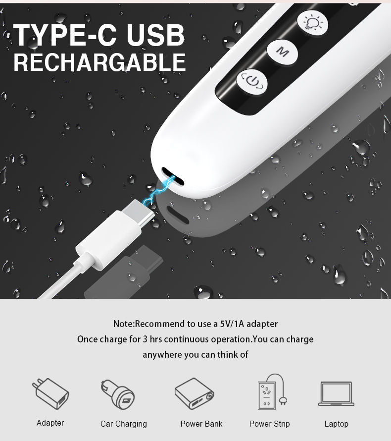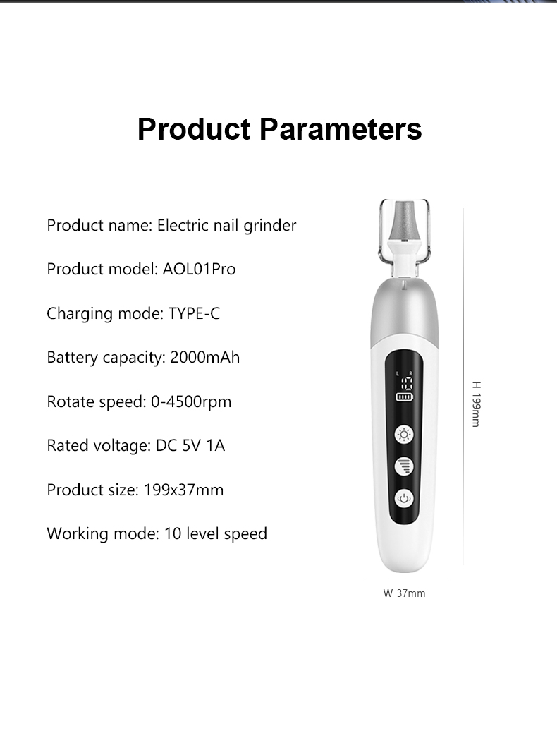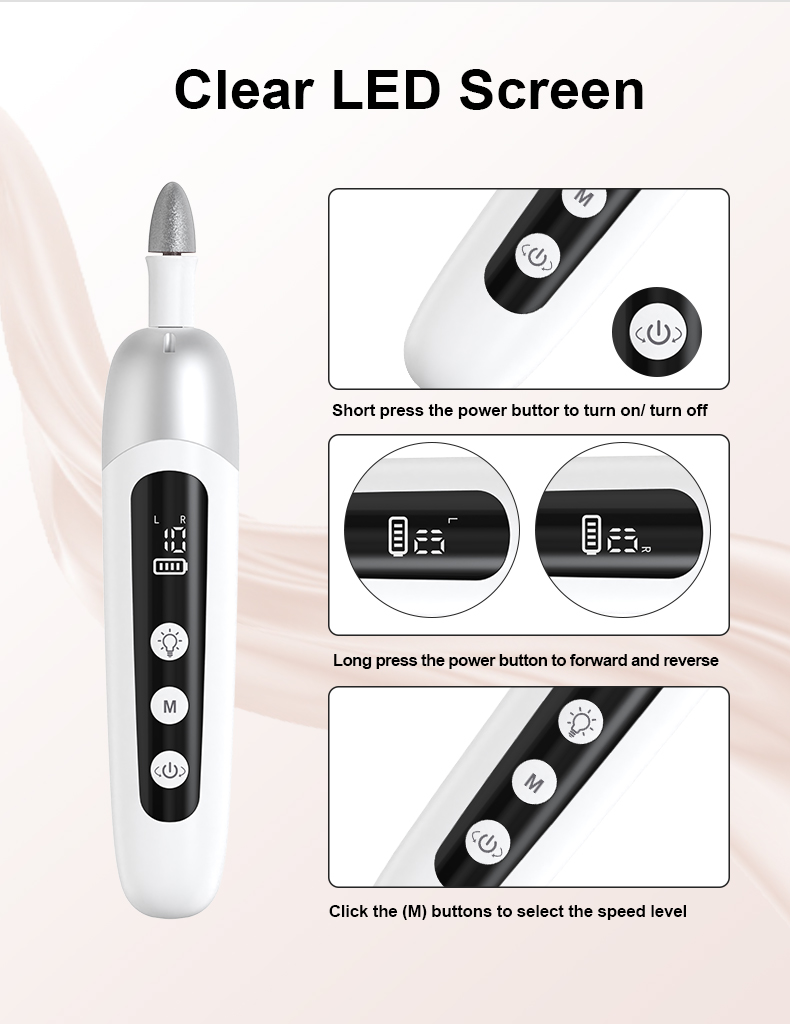 - INNOVATIIVNE LED EKRAAN: navigeerige soovitud seadetes hõlpsalt. LED-ekraan näitab aku olekut, kiiruseelistust ja pöörlemisseadeid, et töö oleks lihtne. Elektriline küüneviilimasin on varustatud ka integreeritud LED-valgustusega, mis valgustab käte ja jalgade piirkondi