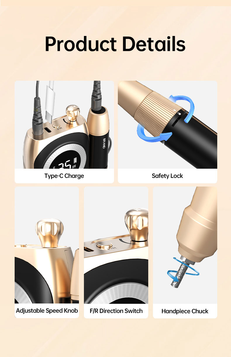 Light Weight Handpiece: Made of the special material, aluminum alloy. Ample ventilation holes are designed for dissipating the heat effectively. Do your nail smoothly and enjoy the feeling of low vibration. It will not let your hand be numb after long-term use. Pencil-shape and lightweight design are perfect for extended use. (works with all kinds of 3/32” shank bits).