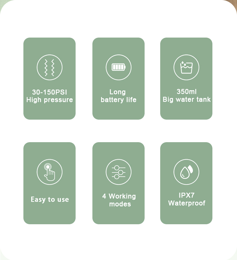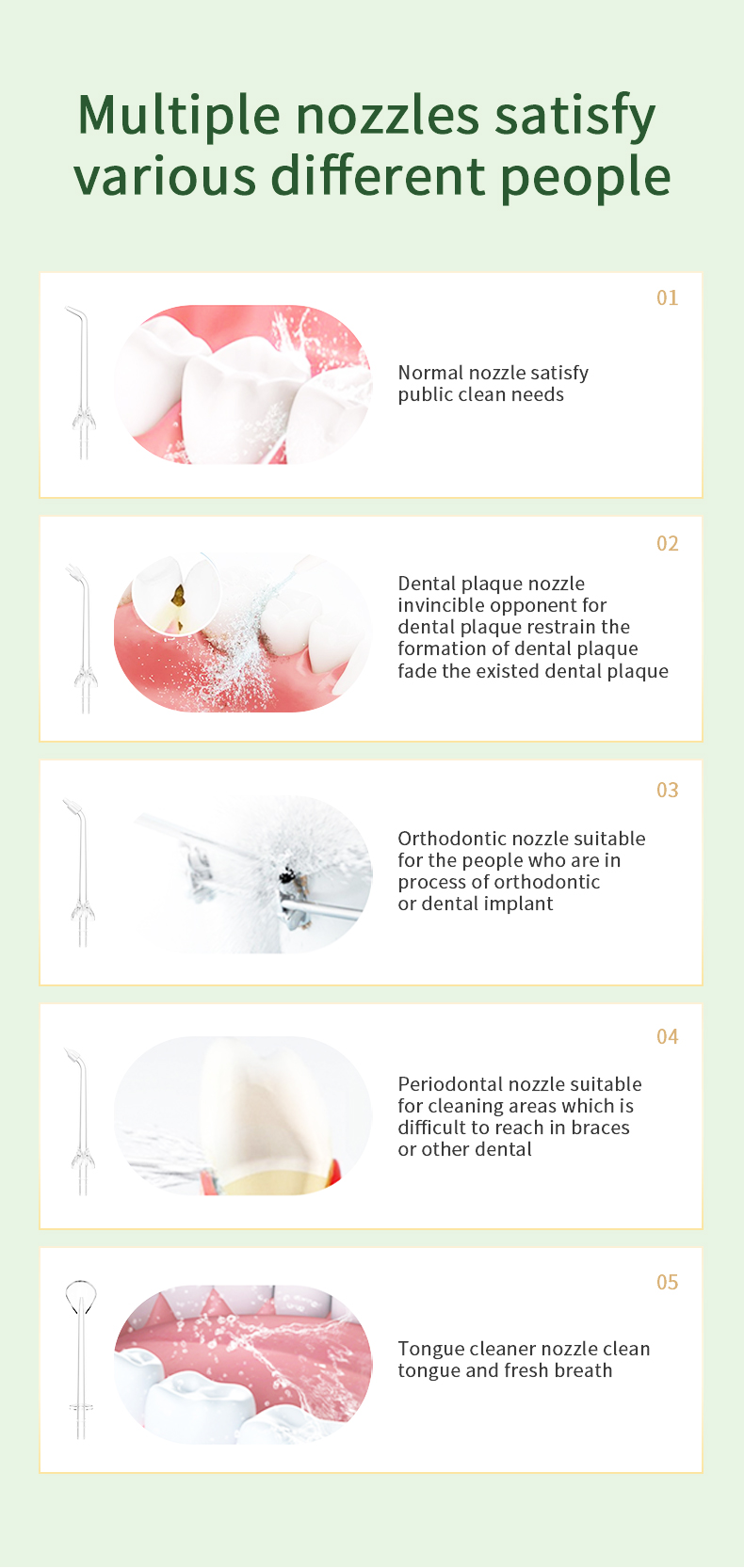 See vesihambakork edastab kõrge veesurveimpulsse 1400–1800 korda minutis, eemaldades tõhusalt 99,9% hambakatust, et hambaid sügavuti puhastada. See vesihambakork masseerib igemeid, soodustab vereringet ja lahendab suuprobleeme, nagu halb hingeõhk, ortodontilised hambad.